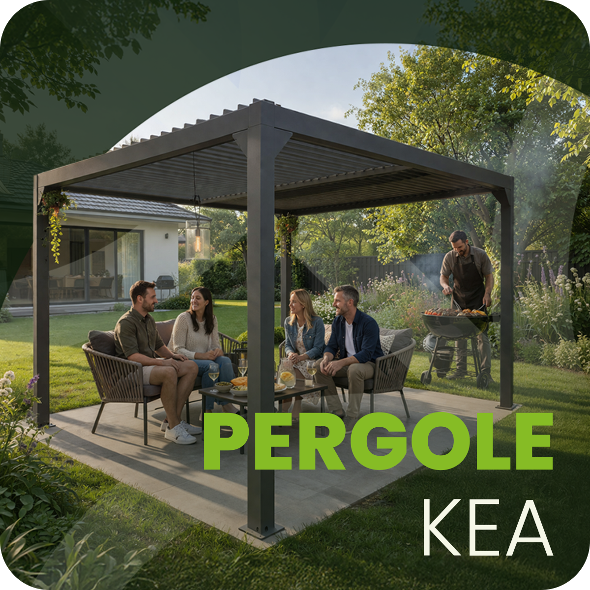 Entdecken Sie unseren Bestseller – die exklusive Terrassenpergola KEA, die Ihren Garten in eine ganzjährige, luxuriöse Entspannungszone verwandelt. Dank der stabilen Aluminiumkonstruktion und des innovativen Lamellendachs erhalten Sie volle Kontrolle über die Sonneneinstrahlung und 100 % Schutz vor Regen.
