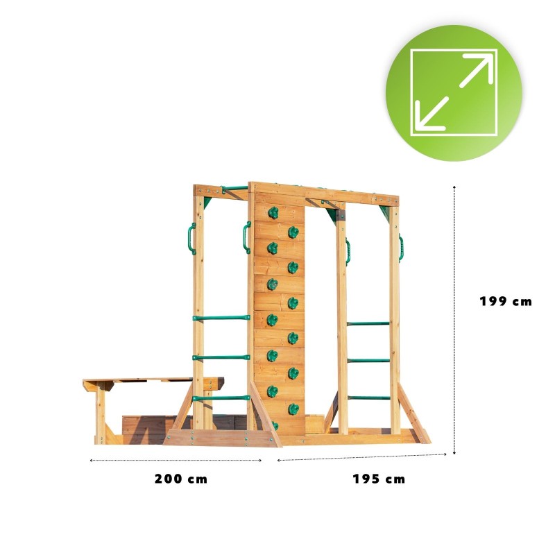 - Lieferumfang: Kletterwand + Kletterleiter + Klettergerüst + Sandkasten
