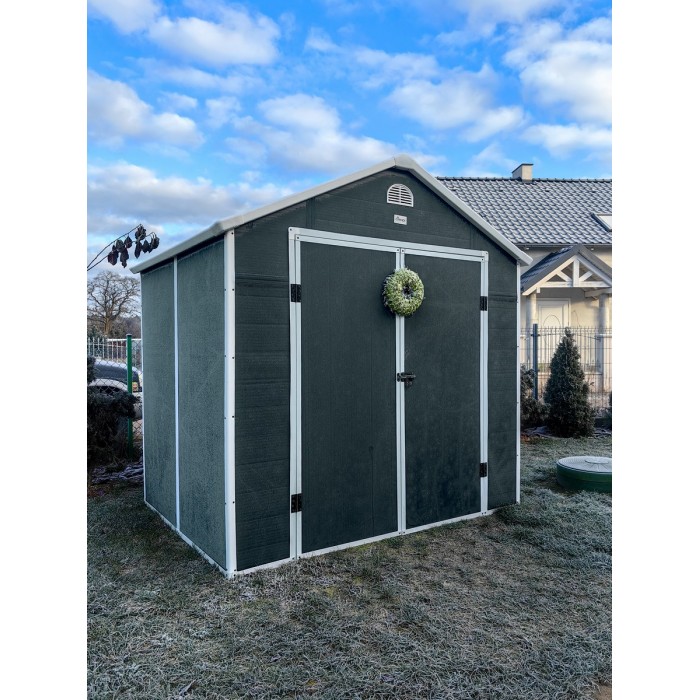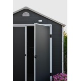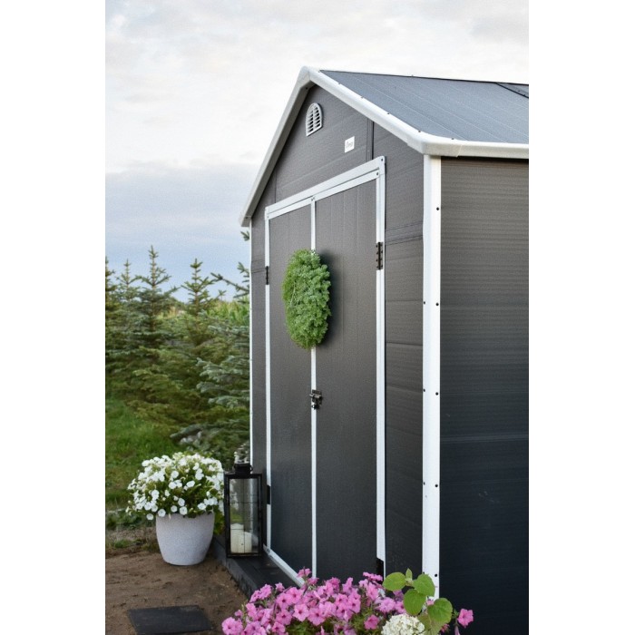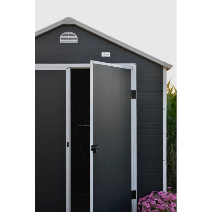 Zwei Lüftungsschlitze sorgen für eine gute Luftzirkulation. Eine breite Schiebetür ermöglicht einen einfachen Zugang zum Gerätehaus. Das Gerätehaus verfügt über ein Fenster aus Polycarbonat.