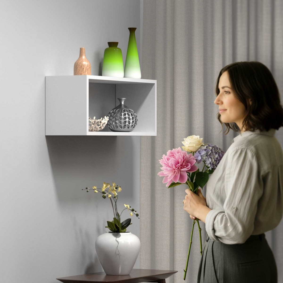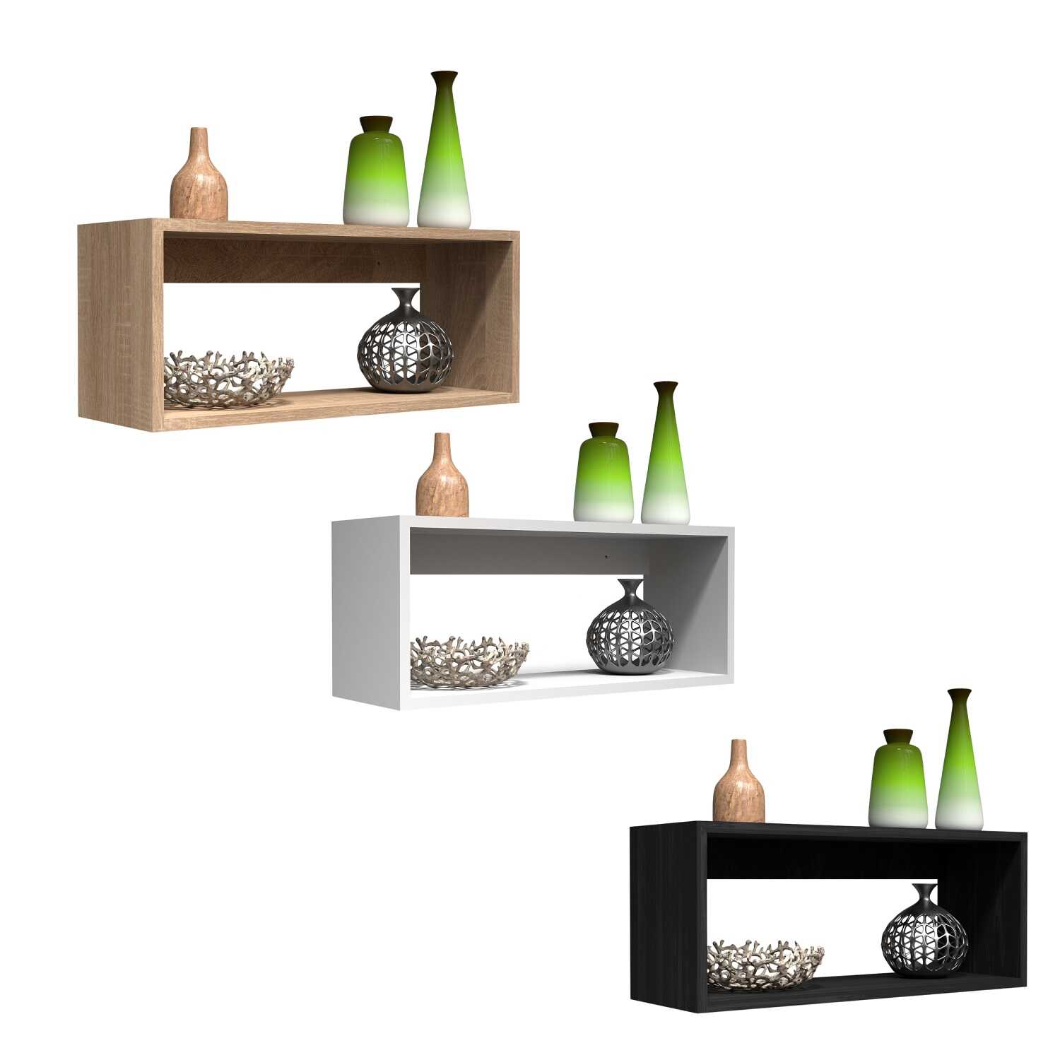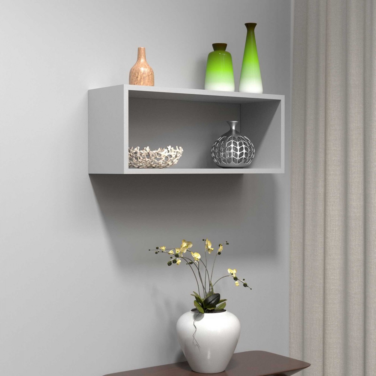 Dank seiner geringen Abmessungen eignet sich das 60 cm breite Hängeregal ideal zur Aufbewahrung von Büchern, Dekorationen, Topfpflanzen oder kleinen Accessoires. Die Wandmontage spart Platz auf dem Boden und verleiht dem Raum eine leichte, moderne Ausstrahlung.
